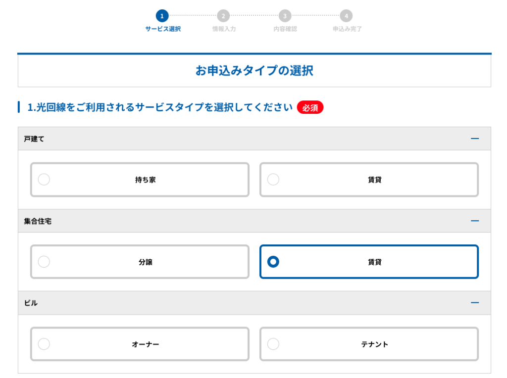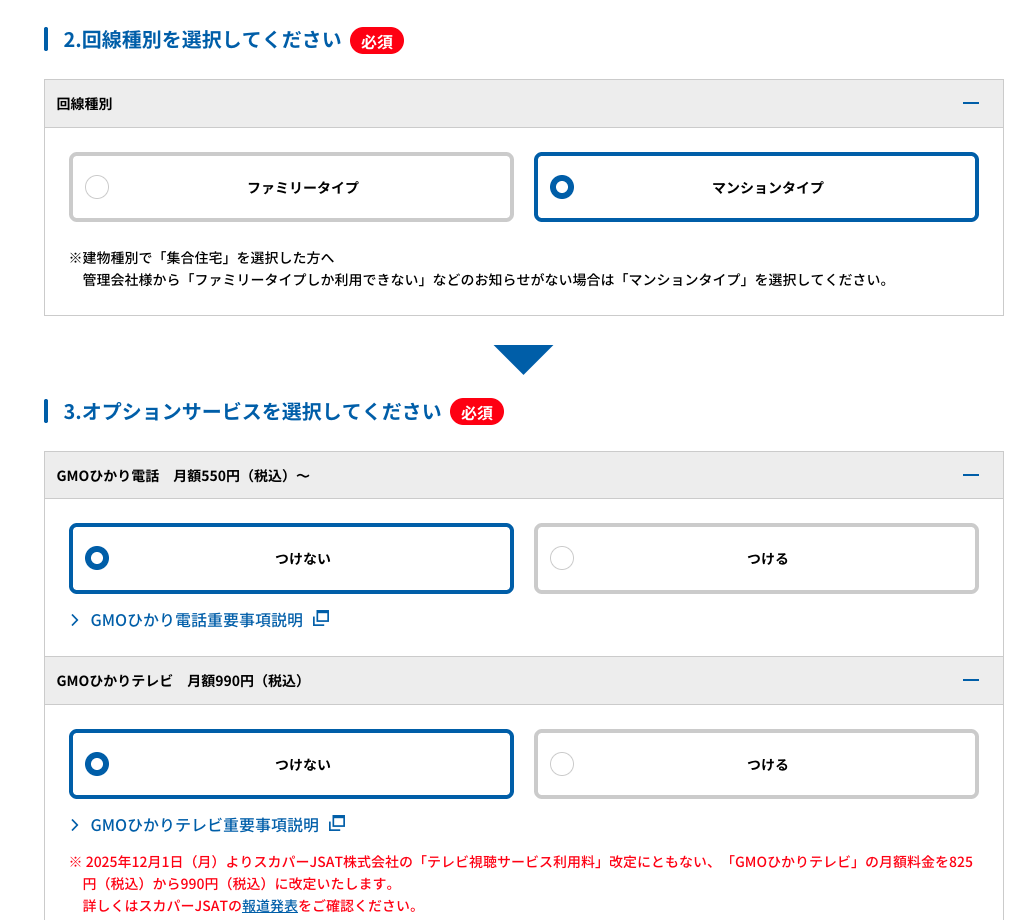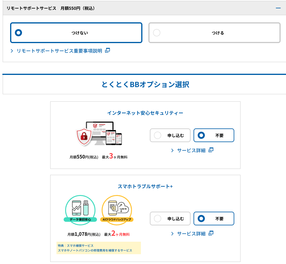 Tiếp theo, chọn gói 10GB(ファミリータイプ) hay 1GB(マンションタイプ) theo như cầu của bạn. Bạn nào có gia đình đông người nên đăng ký gói 10GB, còn nếu muốn tiết kiệm có thể đăng ký 1GB để tiết kiệm và vẫn đảm bảo tốc độ nhé. Các option khác các bạn không có như cầu thì chọn つけない