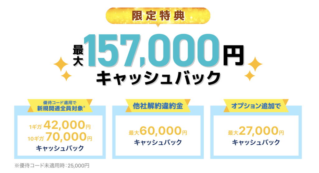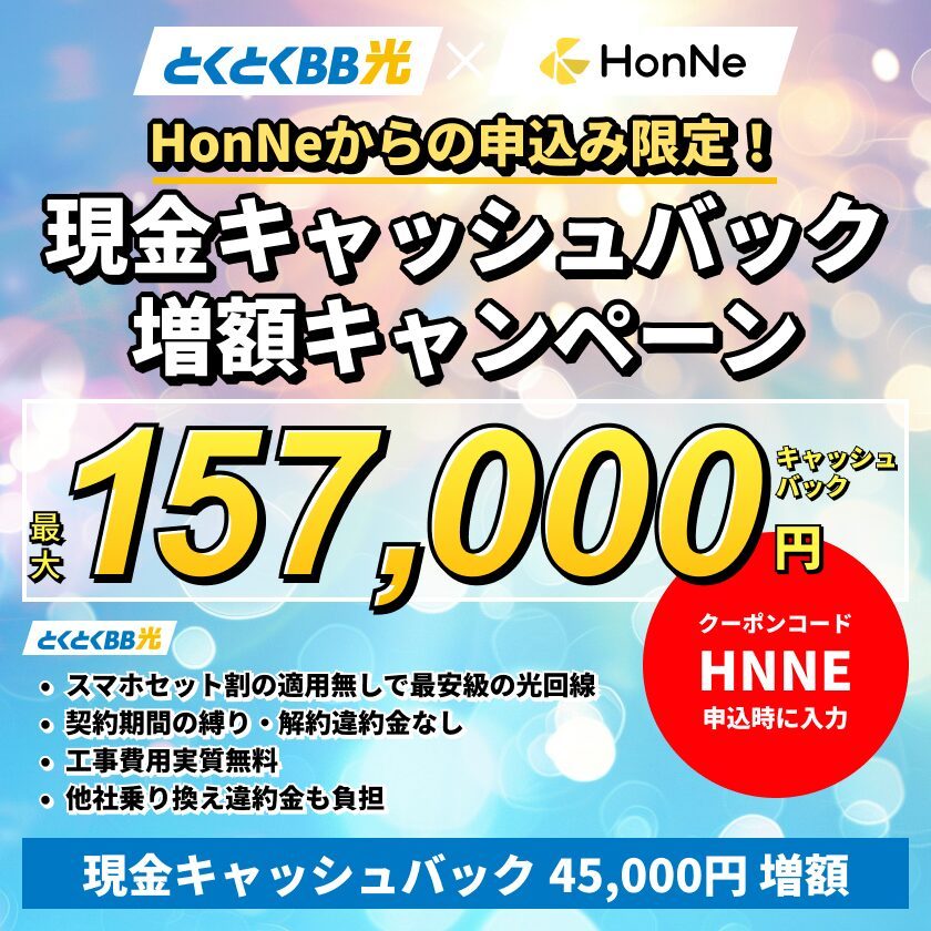GMO Tokutoku BB Hikari đang triển khai chương trình hoàn tiền lên đến 157.000 yên . Trong đó, số tiền hoàn lại sẽ được tăng thêm 45.000 yên dành riêng cho các đơn đăng ký được thực hiện thông qua trang web này.
